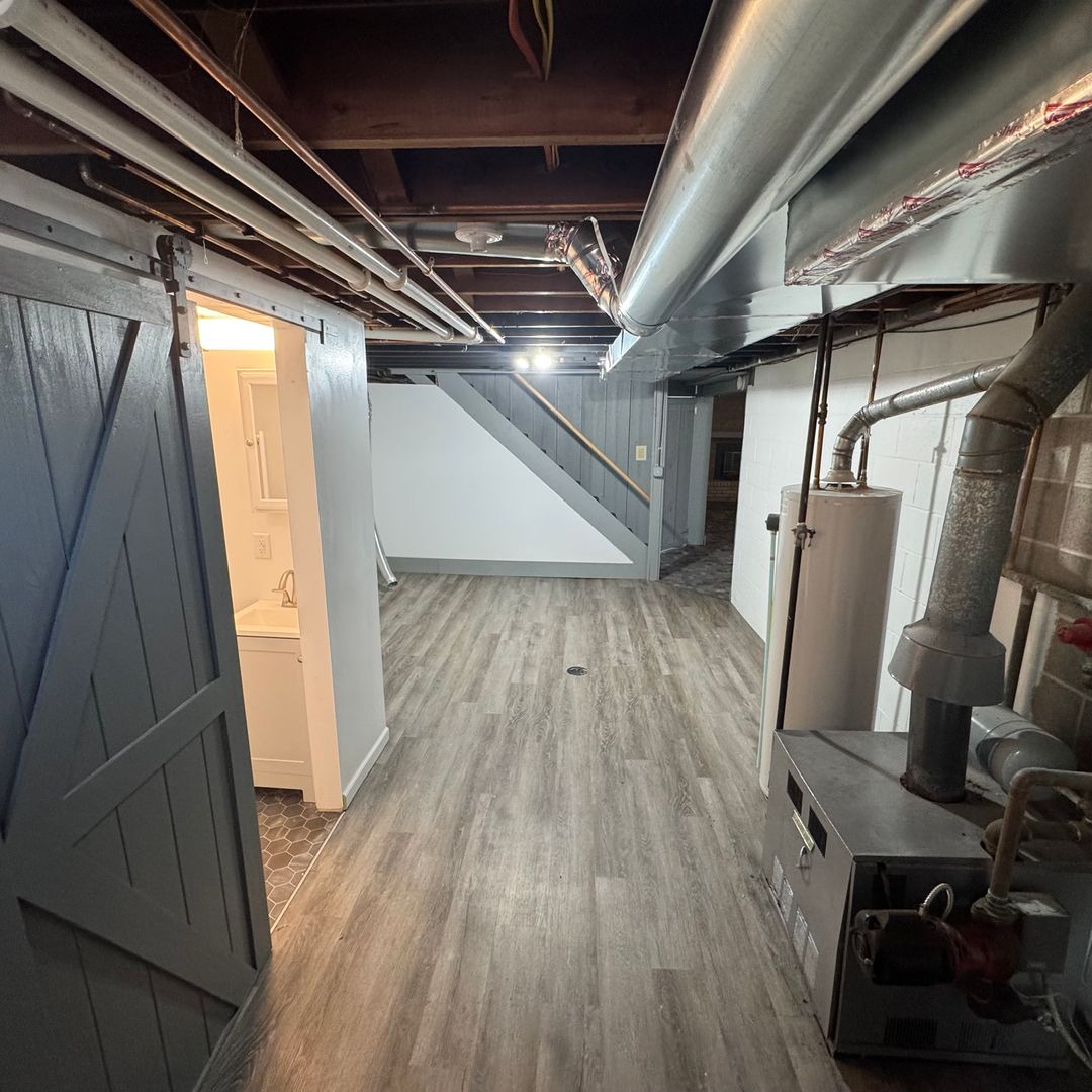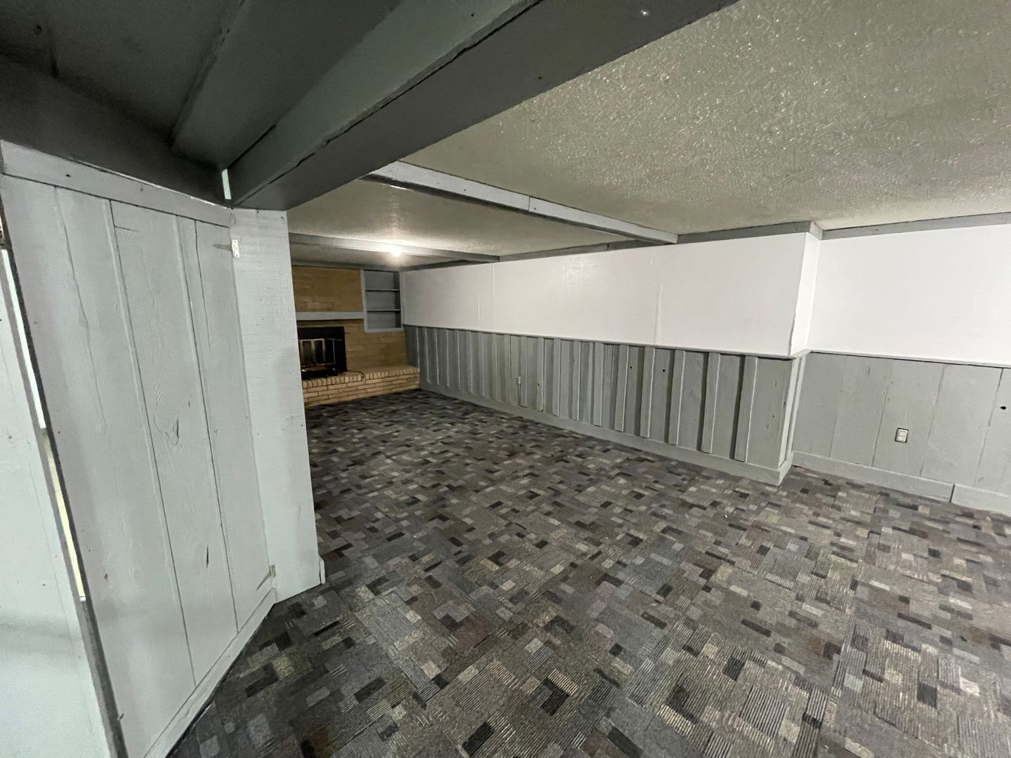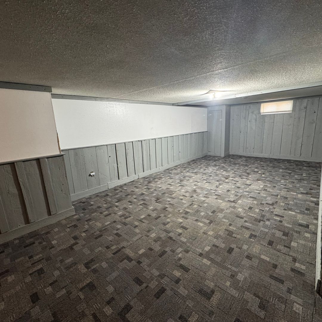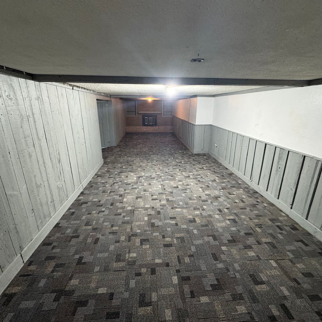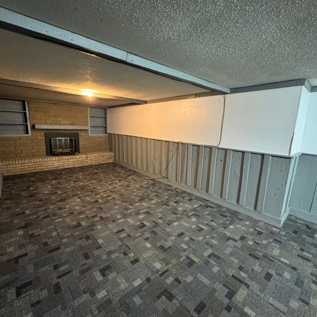 Large recreational space in basement including a fireplace and a large storage room