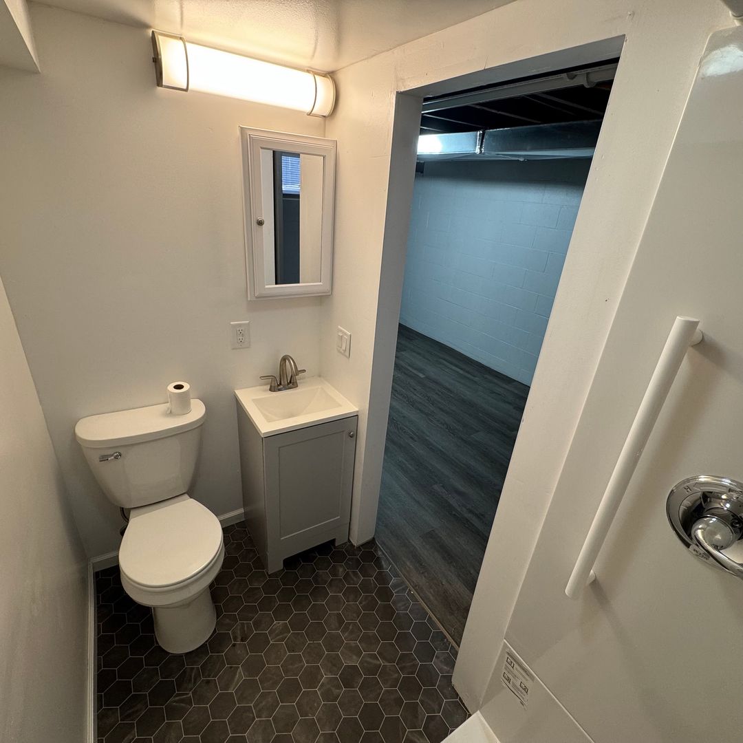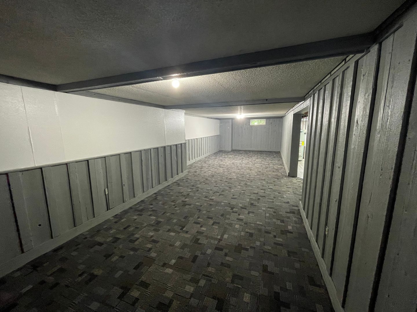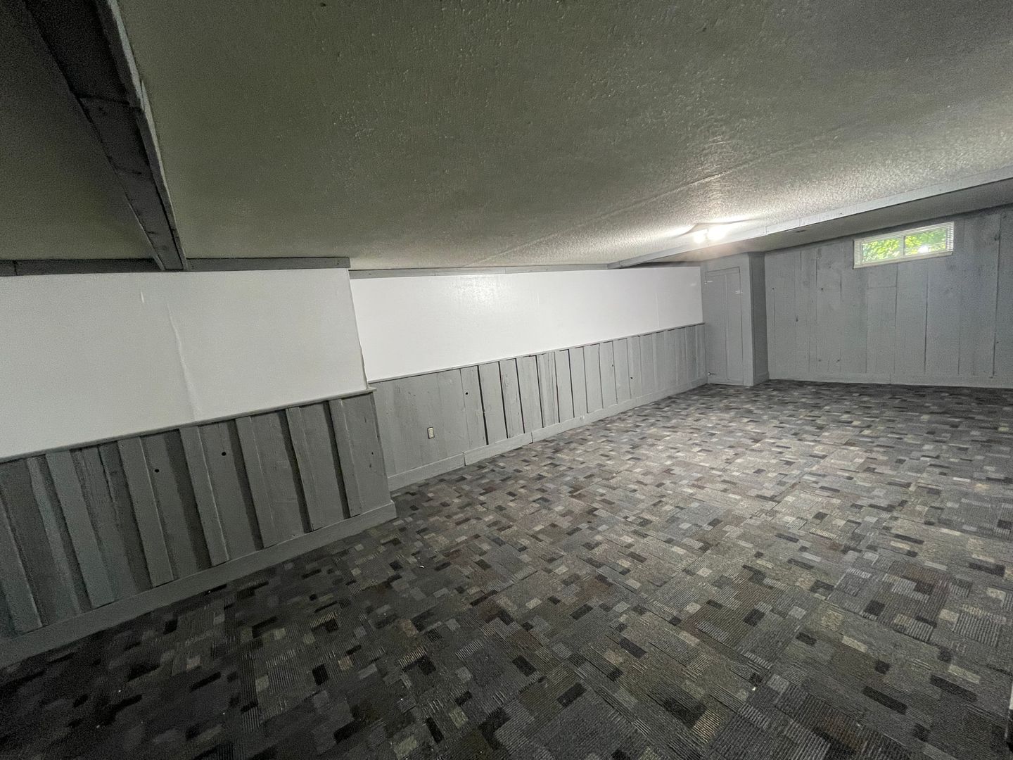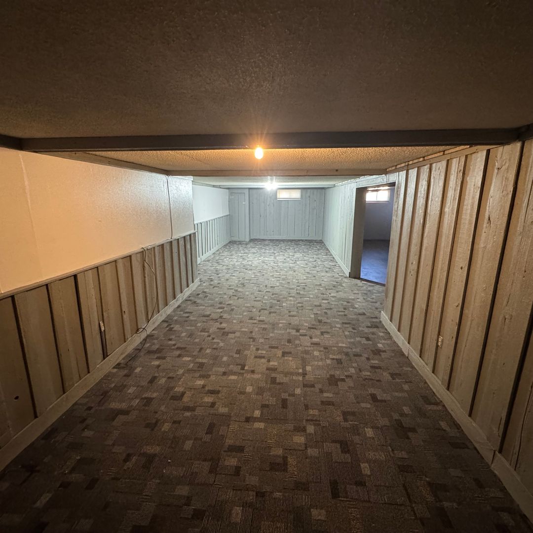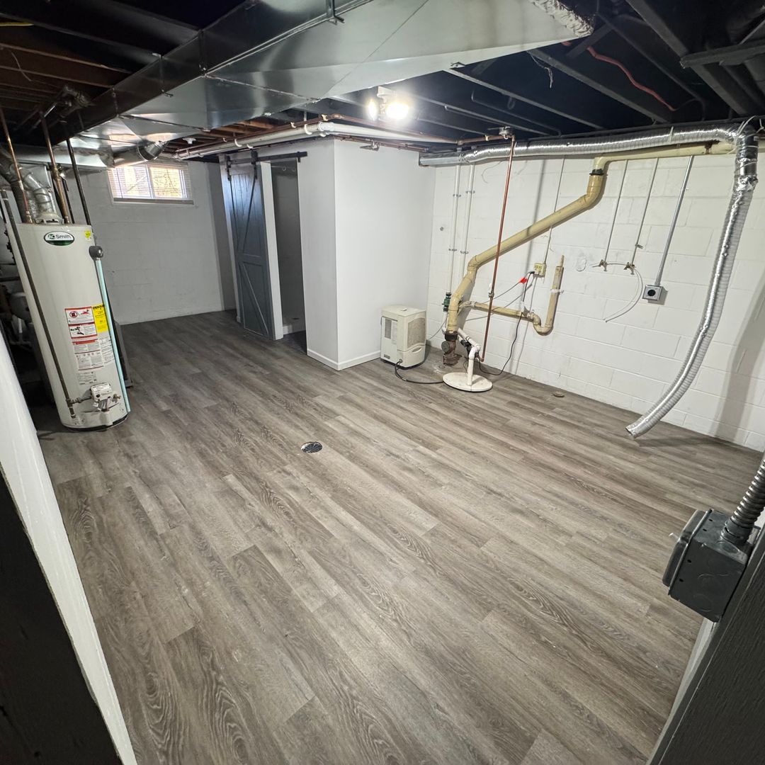Large recreational space in basement including a fireplace and a large storage room
